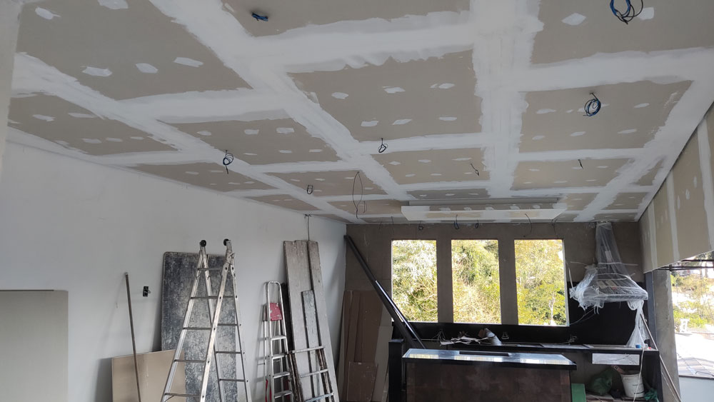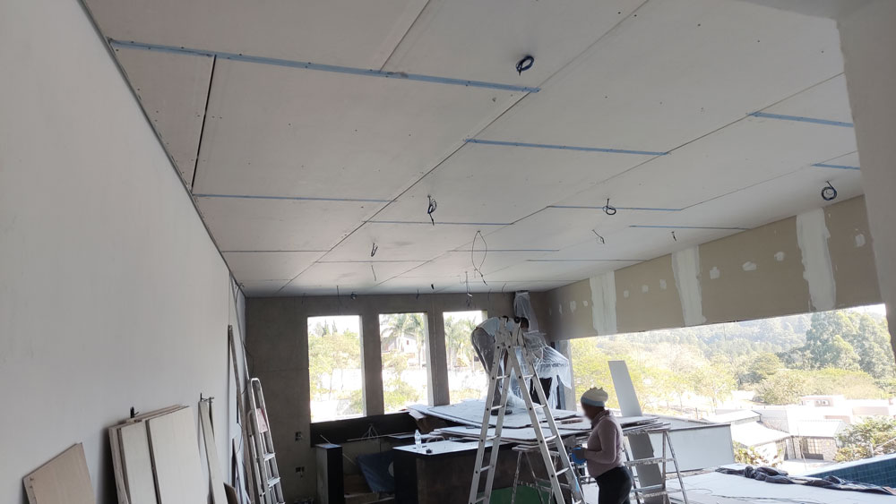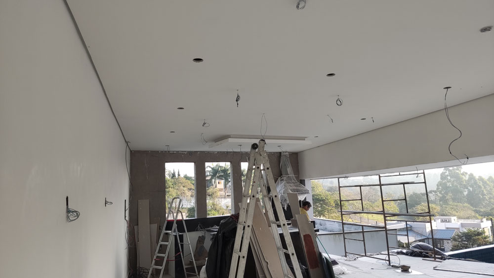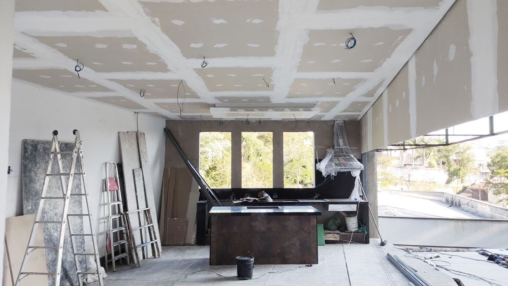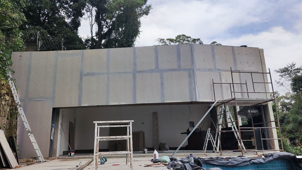 Foi Realizado toda a aplicação de Gesso, Drywall, Placas Cimenticias da Fachada, Elétrica e Pintura